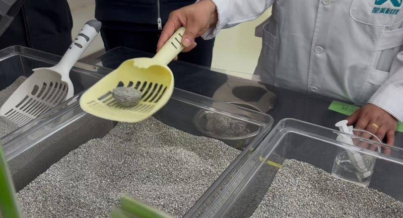 北青报记者在实验室中看到,一名科研人员将模拟猫尿的含盐溶液倒进猫砂里,仅仅两三秒后,科研人员就用铲子取出了已经结团的猫砂球。“除了速度快,我们这里的猫砂结团后还很结实,非常便于猫主人进行清洁。”科研人员表示。
